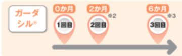 ※2※3:2回目と3回目の接種がそれぞれ1回目の2か月後と6か月後にできない場合、2回目は1回目から1か月以上(※2)、3回目は2回目から3か月以上(※3)空けます。【最短で4か月】