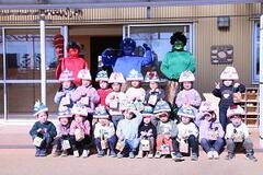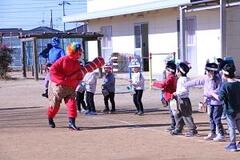 由来について話を聞き、ぶどう組の子どもたちにはインタビューで「心の中のどんな悪い鬼を退治したいか」を発表してもらいました。鬼が登場すると、自分で作ったお面と升を身につけ、一生懸命豆まきをしました。