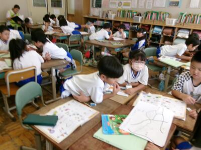 2年生は、町探検の準備として自分の家の周りにどのようなお店や施設があるのか、教え合いました。「この店はこういうところで」「この公園には〇〇〇があって」など、とても楽しそうに話し合うことができました。