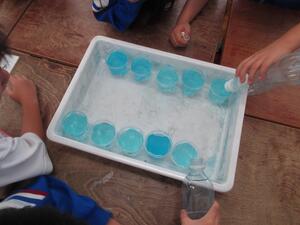 今日はスポーツフェスティバルの予行練習の日でしたが、強風のため明日へ延期になりました。1年生の算数では、「おおきさくらべ」を学んでいます。机のたてと横の長さを鉛筆で測って比べたり、水の量をコップを使って比べたりしました。コップに水を入れて比べるときには、夢中になって行っていました。