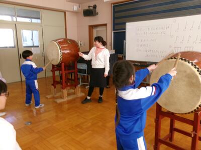 2年生は、音楽の時間に和太鼓でリズム打ちをしました。和太鼓を普通にたたくだけでなく、淵も使って響きの違いを楽しみました。初めて和太鼓を叩いた児童が多く、充実した時間を過ごしました。