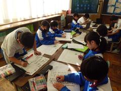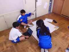 4年生は総合的な学習の時間に、防災学習で学んだことを班ごとにまとめています。模造紙を分け合って分担し、割り付けなどを考えながら進めています。