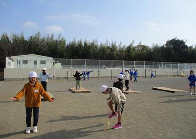 冬の体力づくりの一環で、子供たちは縄跳び練習をしています。友達と楽しみながら、ジャンピングボードを活用して、二重跳びやはやぶさなどいろいろな技にチャレンジしていました。