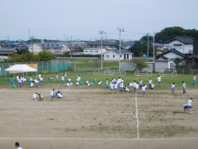 9月22日は3校時から式典、縦割り活動、午後からは係活動が行われました。天気もよく順調に進んでいます。写真は1枚目長縄、玉入れの練習、2枚目は係活動でのグランド整備の様子です。