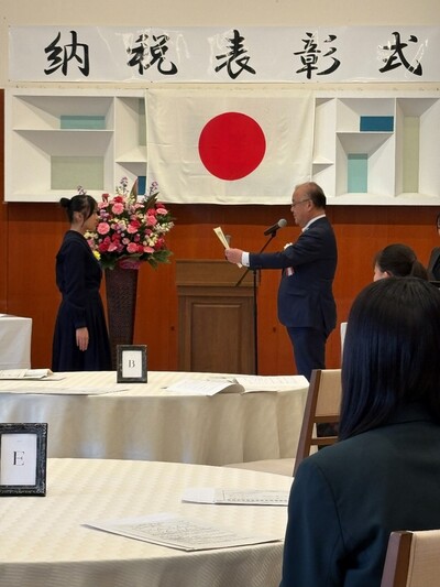 11月19日(水曜日)に納税表彰式が市内のアルシェで行われました。本校からは3年生の生徒が「税についての作文」で表彰を受けました。厳かな雰囲気の中、賞状が手渡されました。