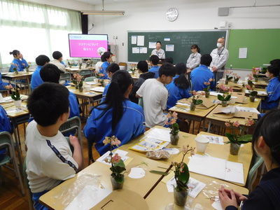 3月6日(金曜日)の3、4時間目に花育プロジェクトを実施しました。大和ハウスの方が来校され、胡蝶蘭の鉢作りを教えてくれました。生徒たちは、卒業に向けてお世話になった人たちへのメッセージを書き、気持ちを込めながら作りました。
