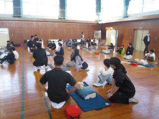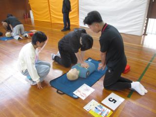 各グループに分かれて胸骨圧迫とAEDの説明