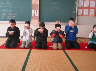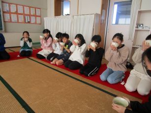 4年生 お茶碗の持ち方もうまくできて、とてもおいしそうです。