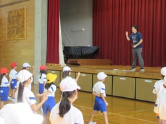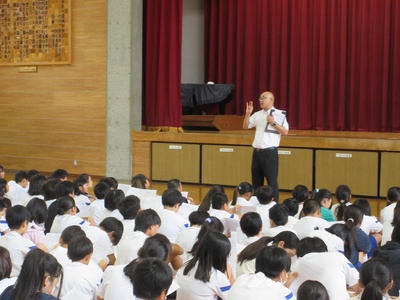本校は、低学年児童と高学年児童の交流を促し、掃除用具の使い方や清掃の仕方を教えるなど清掃活動に力を入れています。中根台中学校区としても清掃の時間は「自問清掃」を進め、心の成長を図っています。そこで、児童集会を開き、なぜ「自問清掃」なのか、どんな力を身に付けてほしいのか、など学校としての考えを校長先生が子どもたちに伝えました。自分にできることを無理をせずにやろう、という話に大きくうなずきながら真剣に聞く児童の姿が見られました。