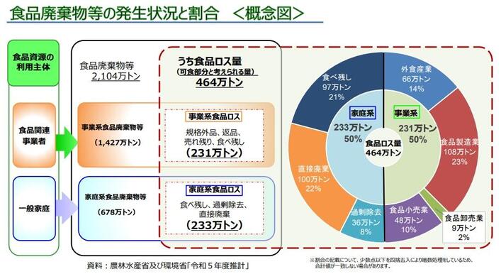 このうち、売れ残り、期限を超えた食品や食べ残しなど、本来食べられたはずの、いわゆる「食品ロス」は年間で約464万トン(令和5年度農林水産省・環境省推計)とされています。