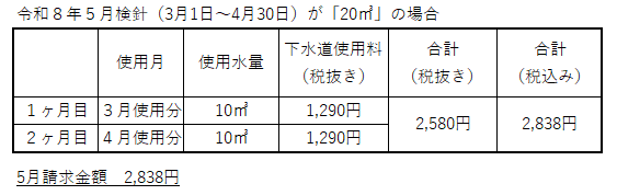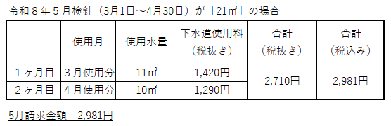 検針した2ヶ月分の使用水量を均等に分割して、1ヶ月ごと(1ヶ月目・2ヶ月目)に算定し、2ヶ月分の使用料をまとめて、ご請求いたします。(算定する際に生じる水量の端数は1ヶ月目に加算します。)