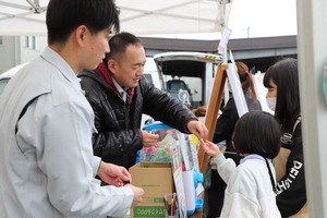 各展示場所で〇×クイズに答えてもらい、全問正解した方には下水道課オリジナルグッズが当たるガチャガチャに参加していただきました。景品として、まいりゅうマンホールデザインのノートやキーホルダーをお渡ししました。