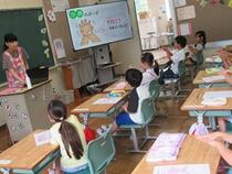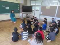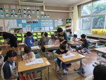梅雨に入り行間休みに外で遊ぶことができないため、1年生の教室に6年生が勉強を教えに来てくれました。