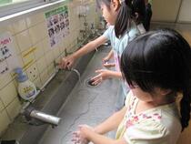 1年生は養護教諭の先生と手の洗い方を学習しました。