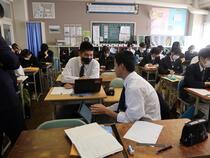 教育委員会の皆様が来校され、本校の生徒の様子や授業を参観されました。ご訪問いただいたのは、教育長、教育委員、教育次長、教育監、指導主事等の6名で、全教員の授業をご参観いただきました。教育委員会の皆様は、生徒たちの真剣な学びの姿に感心されていました。また、市内の小中学校からも多数の先生方が授業参観に来校されました。放課後、指導主事の先生方から、一人一人に授業の指導をいただきました。