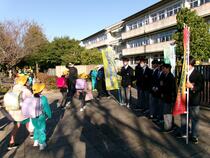 馴馬台小学校に付近に住む3年生と2年生約13名が、馴馬台小学校の校門で、朝のあいさつ運動を行いました。朝から寒い中、生徒も児童の皆さんも元気にあいさつを交わしていました。