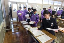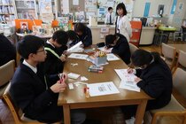 本校は、地域貢献のひとつとして、市社会福祉協議会の「ふれ愛給食サービス」に参加しています。ひとり暮らしのお年寄りに届けられる弁当に、メッセージ入りのかけ紙を作成していますが、本日、2年生が心をこめてメッセージとイラストを書いていました。