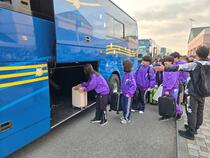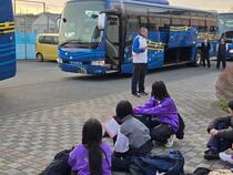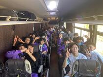 出発式では、実行委員長から「出発前の連休中の過ごし方の注意やスローガンの実現のためにみんなで協力して楽しい宿泊学習にしよう」というような話がありました。生徒たちは、スローガンにもなっている「Unite!(団結)」という目標を再確認しました。