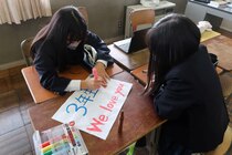 1年1組では、3年生の送る会の装飾準備をしていました。皆、協力しあって取り組んでいました。
