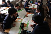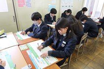 今日は、ライフプランナーである大成裕道氏の他2名を講師としてお迎えし、特別授業をしていただきました。前半は、就職や結婚などのライフイベントが記されたカードを引きながら、将来の暮らしについてゲーム感覚で学びました。後半は、自分の人生の設計図を作成しました。