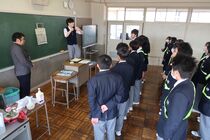 今日は、久しぶりに寒い日でした。3年生は、体育館で卒業証書の受け散り方の練習をしていました。寒い中でしたが、皆、集中して取り組んでいました。1年生は、家庭科の授業で行う「お菓子選手権」に向けての計画を立てていました。決められた材料等の範囲の中で工夫して菓子を作るという学習です。グループに別れて真剣に話し合っていました。その他、1年生の音楽でも心をこめて歌っていたり、2年生の英語ではグループで課題に取り組んでいたりと、皆、元気に一生懸命でした。