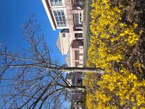 朝、校門で学校運営協議会委員の熊谷さんとともに生徒を迎えました。生徒たちと笑顔で挨拶を交わしていました。校門に入るとレンギョウの花が鮮やかに咲いていました。春ですね。