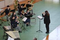 本校体育館で、定期演奏会を開催しました。これは、3年生(卒業生)の完全引退となる演奏会で、「邦ロックメドレー」や「情熱大陸」、「ディズニープリンセスメドレー」「Let‘s swing」、「千の松明」など、アンコールを含め10曲を披露しました。特に今回は、インフルエンザ流行により、アンサンブルコンテストの参加を辞退し演奏できなかった「明日への手紙」と「ピーコック・ブルー」もプログラムに盛り込まれました。その他、コンクール出場曲の「千の松明」では、黒岩先生にも指揮をしていただきました。