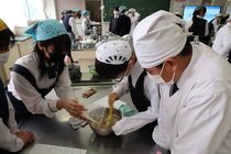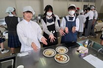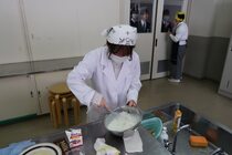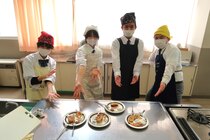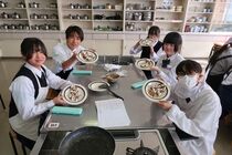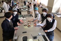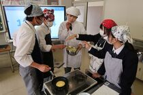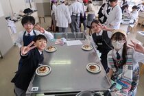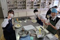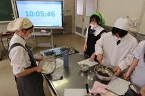 これまで「お菓子づくりコンテスト」と紹介してきましたが、「お菓子選手権」でした。本日3日目を迎え、1年2組が挑みました。メニューは、「パンケーキ」、「ホットケーキサンドアイス」、「ダブルチョコスコーン」、「スコーン&ホットケーキ」、「スコーン」、「クレープ」でした。今までのクラスとは違うメニューがいくつもあり、焼き加減に細心の注意を払い調理していました。「ダブルチョコスコーン」のグループは、作っているうちに「ガトーショコラ風」になってしまうという奇跡の仕上がりとなり、家庭科担当を驚かせました。
