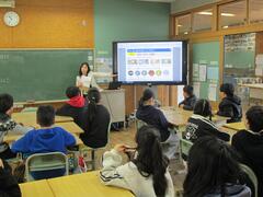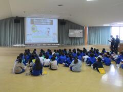 4年生は環境アドバイザーの小川さんを招いて、環境を守るために自分たちに何ができるのか考える学習を行いました。普段よく飲んでいるペットボトルが投げ捨てられ、風などの影響で川や海に飛んでいくと、細かく砕かれてマイクロプラスチックとなって海の生きものに悪影響を及ぼしてしまうことや、それらの海洋汚染がいずれは人間に影響を与えることなど、なぜ環境を守らなければいけないのか詳しく話してくださいました。話を聞いた子供たちも、自分の何気ない行為が環境を悪化させてしまうかもしれないことに気付き、これからの自分の行動について考えていました。とても有意義な授業になったようです。