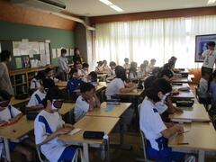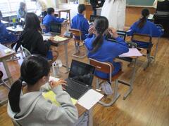 5年生では、オンラインブレンディット授業が行われました。1人1台端末を使い、オンラインで繋がった外国の方と一対一で英語で会話をしました。子供たちは外国の方からの質問に答えたり、事前に用意した質問をしたりしながら、英語の会話を楽しんでいました。初めて会う外国の方との会話に緊張しているようでしたが、終わった後には充実した表情になっていました。今後の英語の学習に弾みがつきそうです。