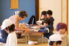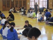 馴柴まちづくり協議会の皆さんや保護者の方を交えて、1年生が昔遊び交流会を行いました。多目的室の和室では、折り紙を教えていただき、新聞紙を使って頭にかぶれるほどの大きな兜を折リました。体育館では、お手玉のビデオを見ながらいろいろな技を練習して、東京おてだまの級位認定に挑戦していました。地域のお年寄りの方から教えてもらいながら、日本に昔から伝わる遊びを体験した子供たちは、ゲームなどとは違った楽しさを味わいながら、楽しんで活動することができました。