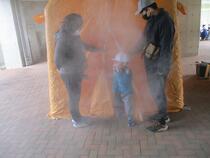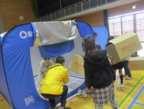 煙体験では、無害な煙で満たしたテントの中を火事場に見立てて通り抜けました。煙で先が見えない中避難することの難しさを体験しました。消火訓練では、消火にの扱い方や噴射の姿勢などを学び、火に見立てた的を狙いましたが、なかなか上手に当たらずに苦戦しているようでした。避難所設営訓練では、指示された区画に分かれ、配給された段ボールベットや簡易テントの組立などを行いました。実際の避難所では、毛布や段ボールベットなども全員に行き渡らないこともあり、そのようなときにはどうすればいいのか、自分の家から避難所に持って行った方がいいものは何かなど、実際に災害起きたときのことを考えながら体験することができました。