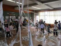 11月26日(火曜日)、2年生が川原代小学校との交流活動を行いました。今年度の活動は、図工の「つないでつるして」です。各自が用意した新聞紙を細長く裂いて、川原代小学校の友達も交じっての制作活動は、子供たちの発想が生かされた素晴らしい作品づくりになりました。最後は3つの教室に飾られた作品をお互いに見合う鑑賞会を行い、活動を終了しました。