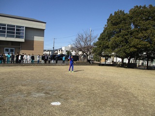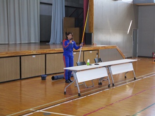 講演会では、子ども達から「投げるところを見たい」の声が上がり、急遽、グラウンドでやり投げの実演が行われました。