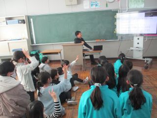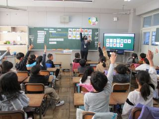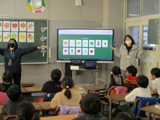 1、2年生は毎月1時間外国語活動を実施しています。今月の2年生のテーマは「果物」です。たくさんの果物の名前を英語で練習した後に、好きな果物を英語で尋ねたり答えたりしていました。ALTのマリア先生が準備したゲームに興味をもち、たくさんの児童が挙手をしてゲームに挑戦していました。