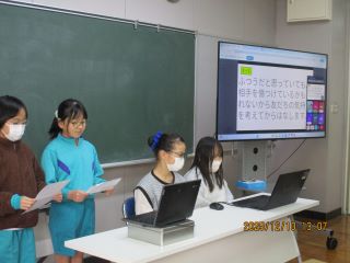 ロング昼休みの時間に、第2回いじめ防止集会をオンラインで実施しました。今回の集会では、6月に決めた各学級の「いじめ防止宣言」についての振り返りの発表と、児童委員会が作ったクイズ形式の劇の発表がありました。どの学年も、代表の人の発表を真剣に聞くことができ、全校でいじめについて考える機会となりました。