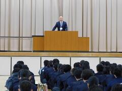 冬季休業前の全校集会が開かれました。明日から始まる冬休みを有意義なものにするため、真剣な態度で話を聞く生徒の姿が見られました。