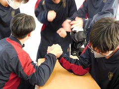昼休みに腕相撲をして楽しむ生徒の様子です。