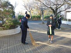 龍ケ崎中学校の「朝活」は、昇降口前の落ち葉掃きです。