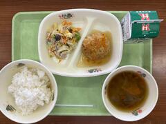 本日の献立は、ご飯・牛乳・豆腐ハンバーグ和風あん・豚肉ときのこのサラダ・さつまいもの味噌汁でした。