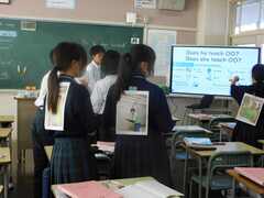 1年生の英語の授業の様子です。背中に貼られている人物を当てるコミュニケーション活動を行っています。昇龍祭が終わり、気持ちを切り替えて、意欲的に学習しています。