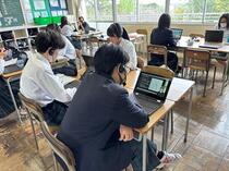 生徒たちはタブレット端末を活用しながら課題に主体的に取り組み、互いに考えを共有し合う姿が見られました。