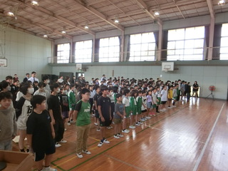 本日は、1時間目に前期の終業式が行われました。体育簡に全校児童が集まりました。