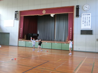 4年生の児童が、毎日体育館でジャベボールを使って練習をしています。少しずつ、投げ方がきれいになってきて、ジャベボールを遠くに投げられるようになってきました。