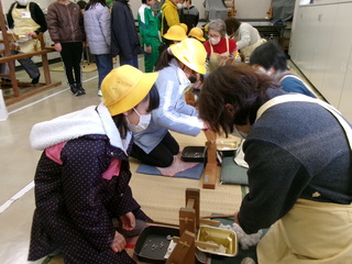 グループごとに、さき織体験や、昔使われていた道具などの見学をしました。