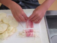 今日の5・6時間目の家庭科の時間に、6年生が調理実習を行いました。今回のメニューは、「野菜のベーコン巻き」と「ベーコンポテト」の2品。子供たちは、ジャガイモやにんじん、たまねぎなどを適当な大きさに切ったり、えのきをベーコンで巻いたりと、協力しながら丁寧に準備を進めていました。班ごとに調理を進め、できあがった班から、さっそく試食に入りました。「おいしい!」という声に混じって「ちょっとかたい?」といった声も聞こえてきました。子供たちには、今日のレシピを、ぜひお家でも再現してほしいと思います。