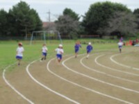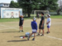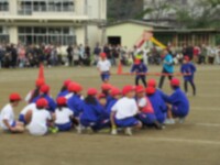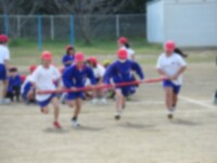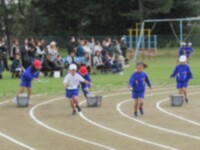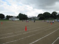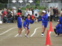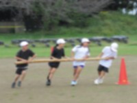 「龍の子紅白大合戦」で3・4年生が挑戦する団体種目の名前は「台風の目」です。これは3~4人のチームが1本を棒につかまり、カラーコーンの周りを回りながらコースを走り、次のチームへ棒をつないでいくというリレー種目です。本番を来週に控え、今日は実際に競技を行いながら入場から退場までの動きを確認しました。スタートの合図とともに、各組の第1走者が力強くスタートして競技が始まると、同じ組のチームを応援する子供たちの声が、グランドに大きく響いていました。