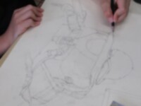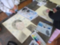 4年生が取り組んでいる絵画の題材は、水彩による自画像です。学習者用端末で撮影した自分の写真を参考にしながら、鉛筆で下絵を描き、絵の具で彩色していきます。今は、ほとんどの子供たちが下絵を描き終えて、彩色に入っています。絵の具は、陰影に注意しながら、明るいところから薄く塗り始め、少しずつ色を重ねていきます。子供たちは、写真を確認しながらゆっくりと塗り進めていました。