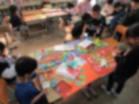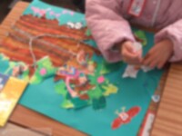 1年生が図工の時間に取り組んでいるのは「木となかよし」という題材です。これは、画用紙の中央に紙を貼って大きな木の幹を作り、そこに折り紙を切って貼ったり、色を塗ったりしながら枝を広げ、夢いっぱいの木を作り上げるというものです。木の上で楽しく遊ぶことを想像しながら作品を仕上げていくので、枝には紙に描いた自分や友達の姿や、木に登るためのはしごやロープなども貼り付けられています。子供たちは友達とお互いの作品を見合ったりしながら、楽しそうに制作していました。