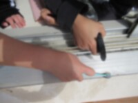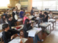 今日の3年生の音楽は、合奏でした。それぞれが「木でできた楽器」「皮をはった楽器」「金属でできた楽器」など様々な楽器を持ち、その音を組み合わせていきます。楽器ごとの音の出し方を確認した後は、先生が示すリズムや音の強弱に併せて、実際に楽器を演奏しました。皆、楽しそうに音を出していましたが、音が合うまでには、もう少し時間がかかりそうです。それぞれの楽器が組み合わさったときに、どんな音になるのか楽しみですね。
